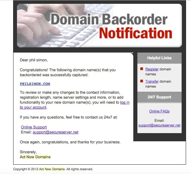 In November of 2012, Act Now Domains alerted me that www.philsimon.com had finally become available. I had agreed to scoop it up for the paltry sum of $70. (I would have paid much, much more.)