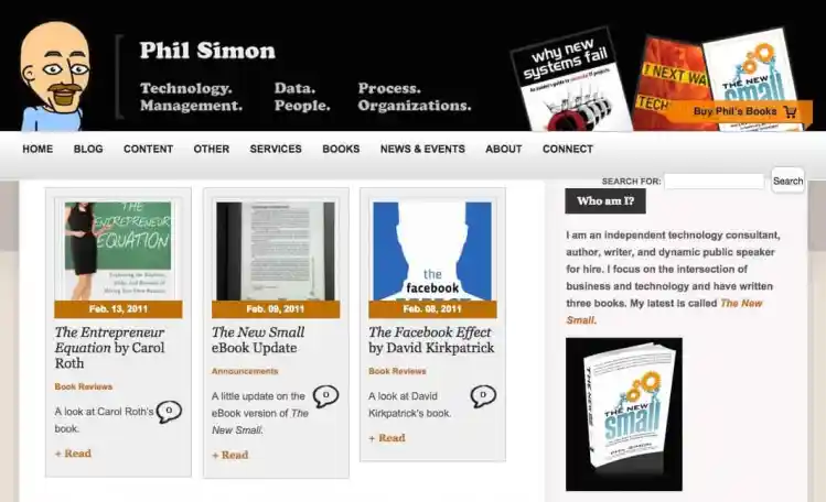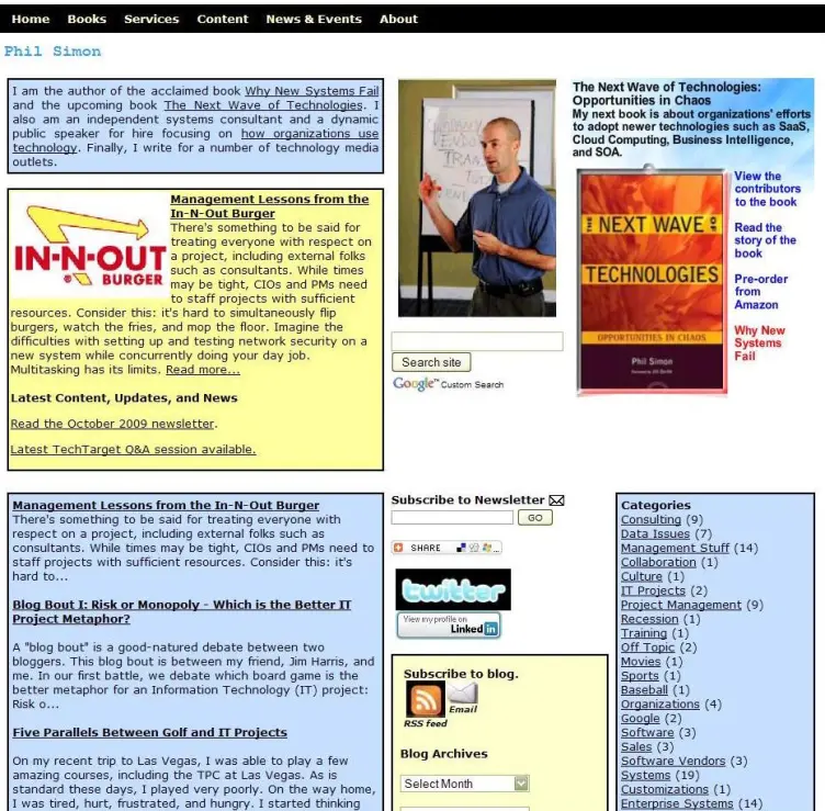 At the end of 2008, I was knee-deep in writing the first version of Why New Systems Fail. I realized that publishing a book without a supporting website behind it didn’t make a great deal of sense. After buying the domain, I developed, and launched www.philsimonsystems.com. Why that domain? Simple: the site www.philsimon.com was already taken, and I couldn’t think of a better URL. Another Phil Simon in Pennsylvania owned its rights.