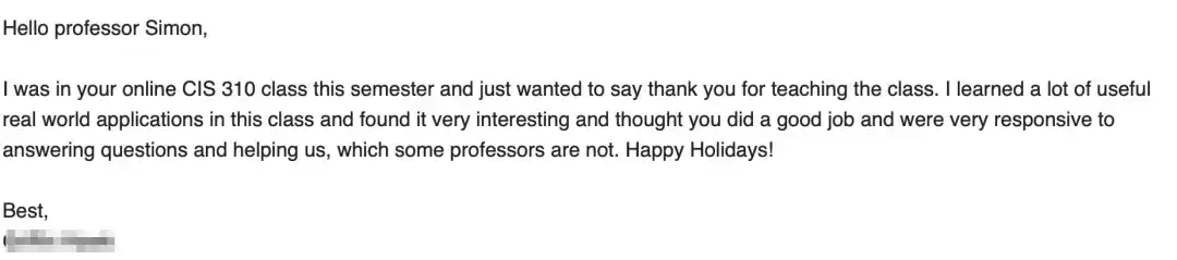 “Phil Simon is an engaging lecturer with a talent to make any topic interesting. He made great efforts to accommodate students’ needs and was always willing to help. It was a sincere privilege to be taught by such an accomplished and knowledgeable man.”