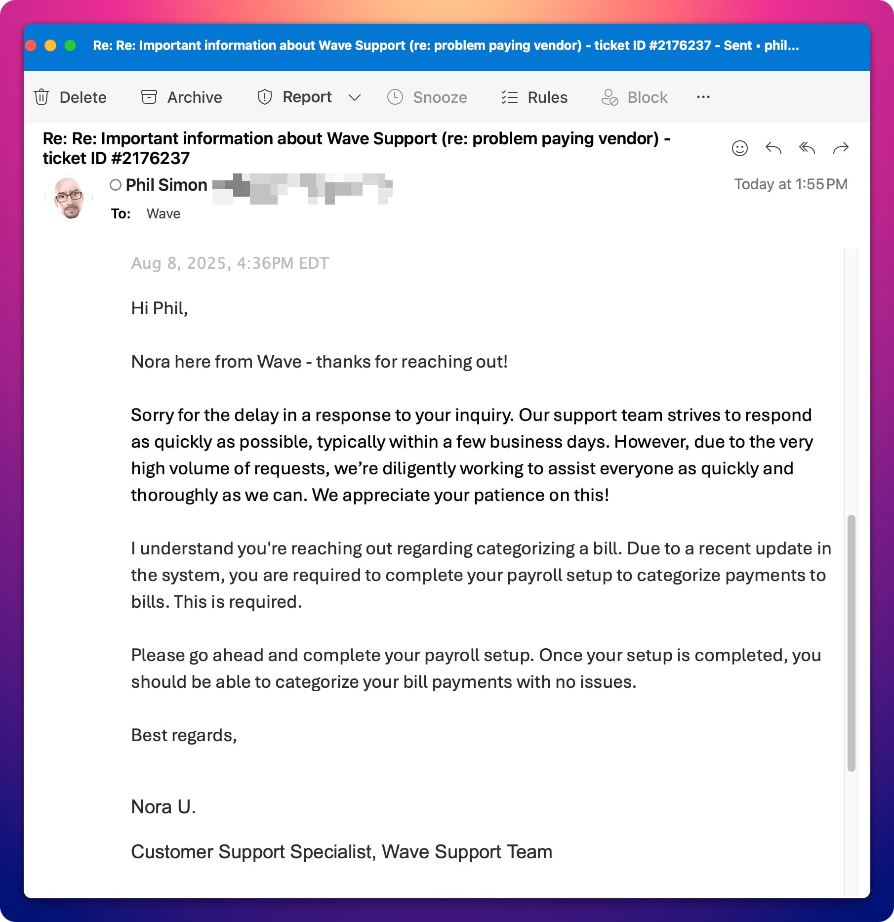 Nearly two months after I opened a ticket, I finally heard from the clowns at Wave. You just can't make this up.