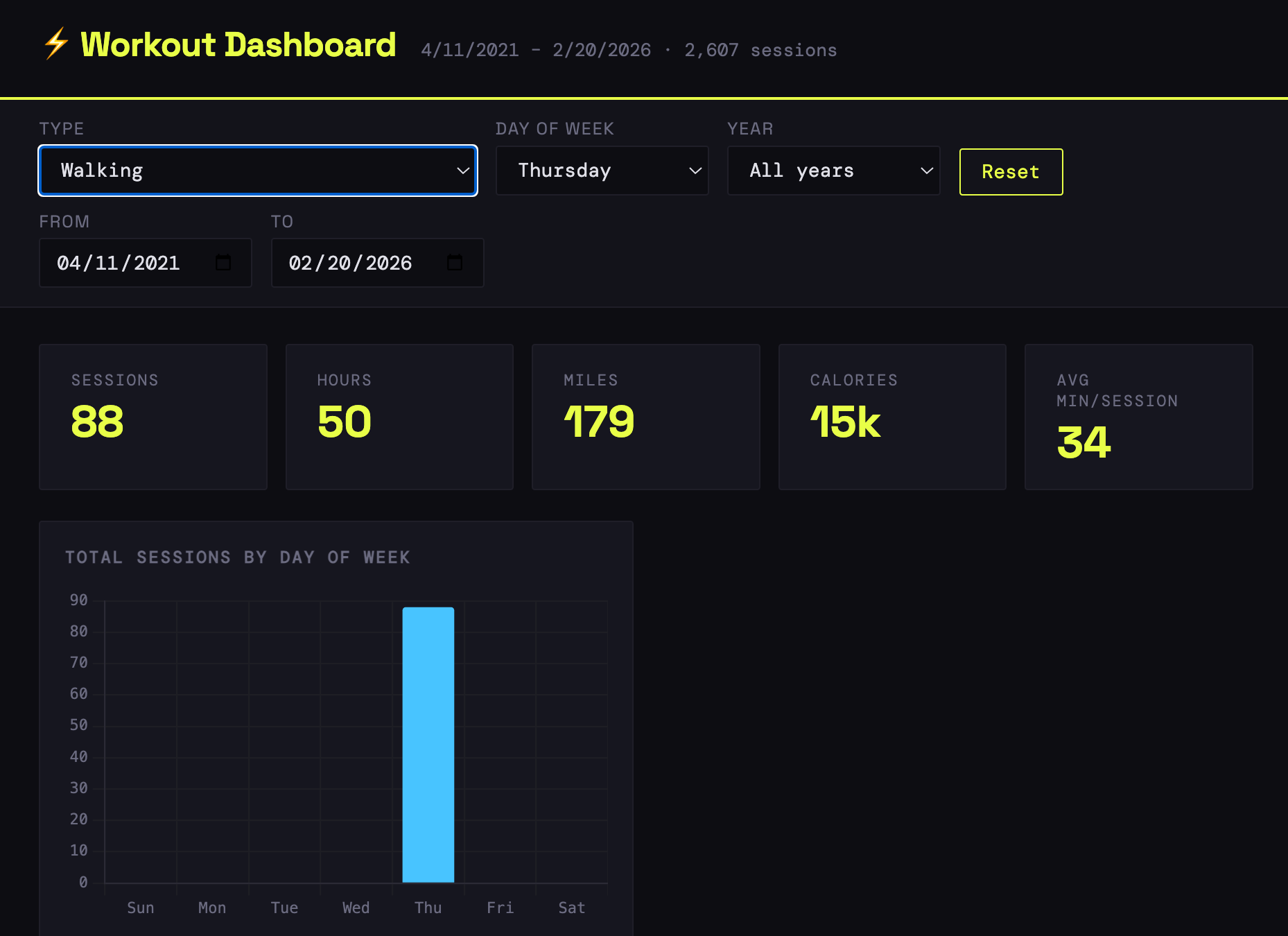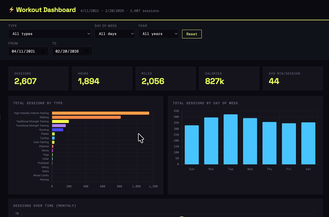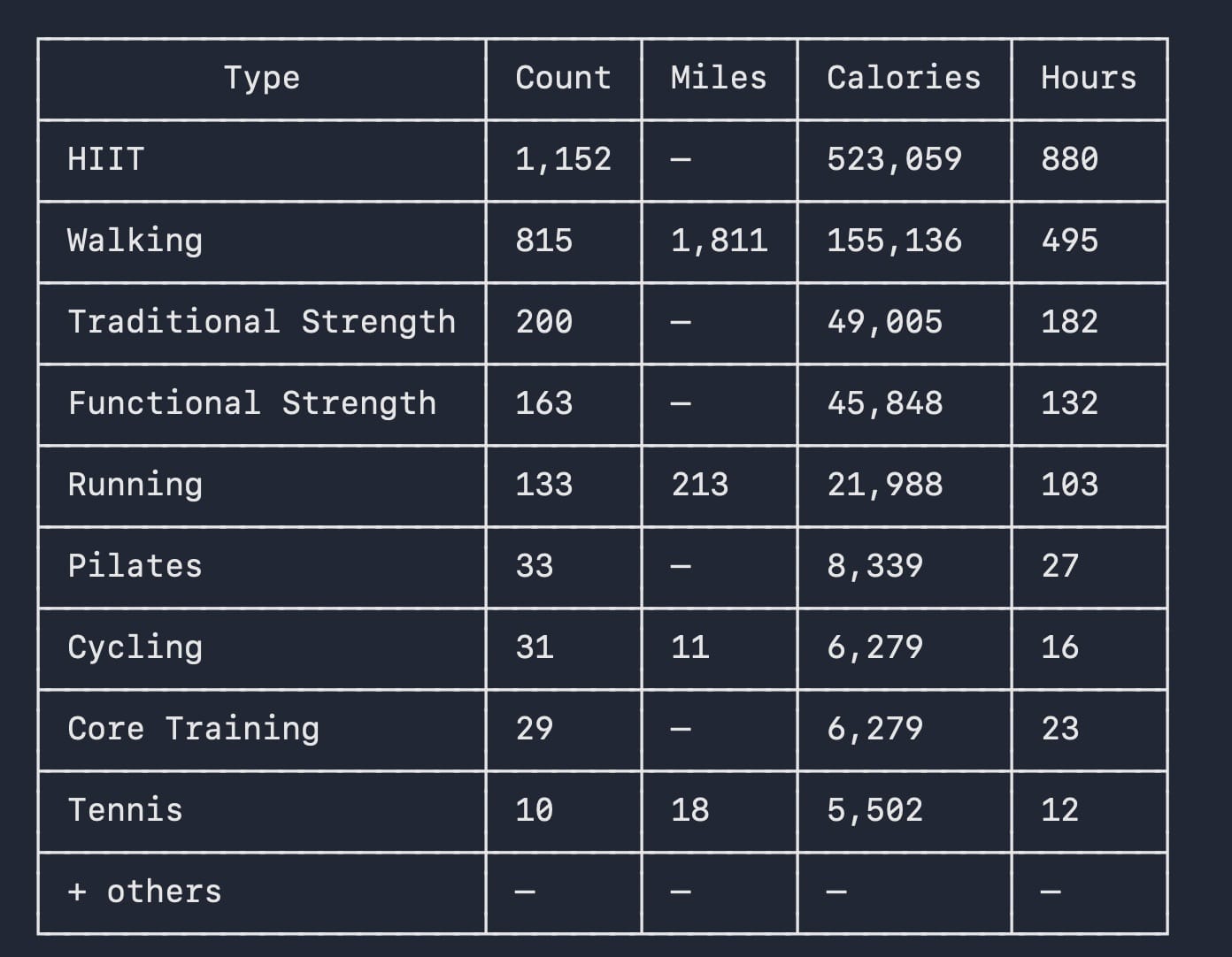 Despite these limitations, my little creation provides insights into my exercise history that Apple Health and Strava—apps with tens of millions of users—currently don't.1 It's not even close.