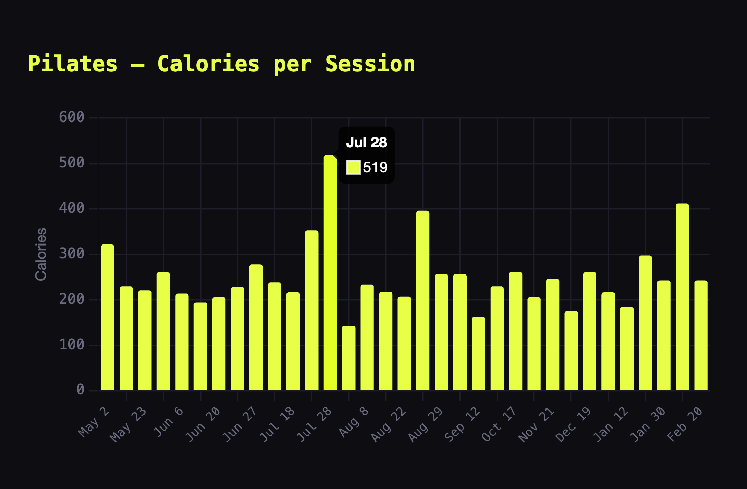 Mouse over a part of the bar chart, and the date and the number of calories burned appear.