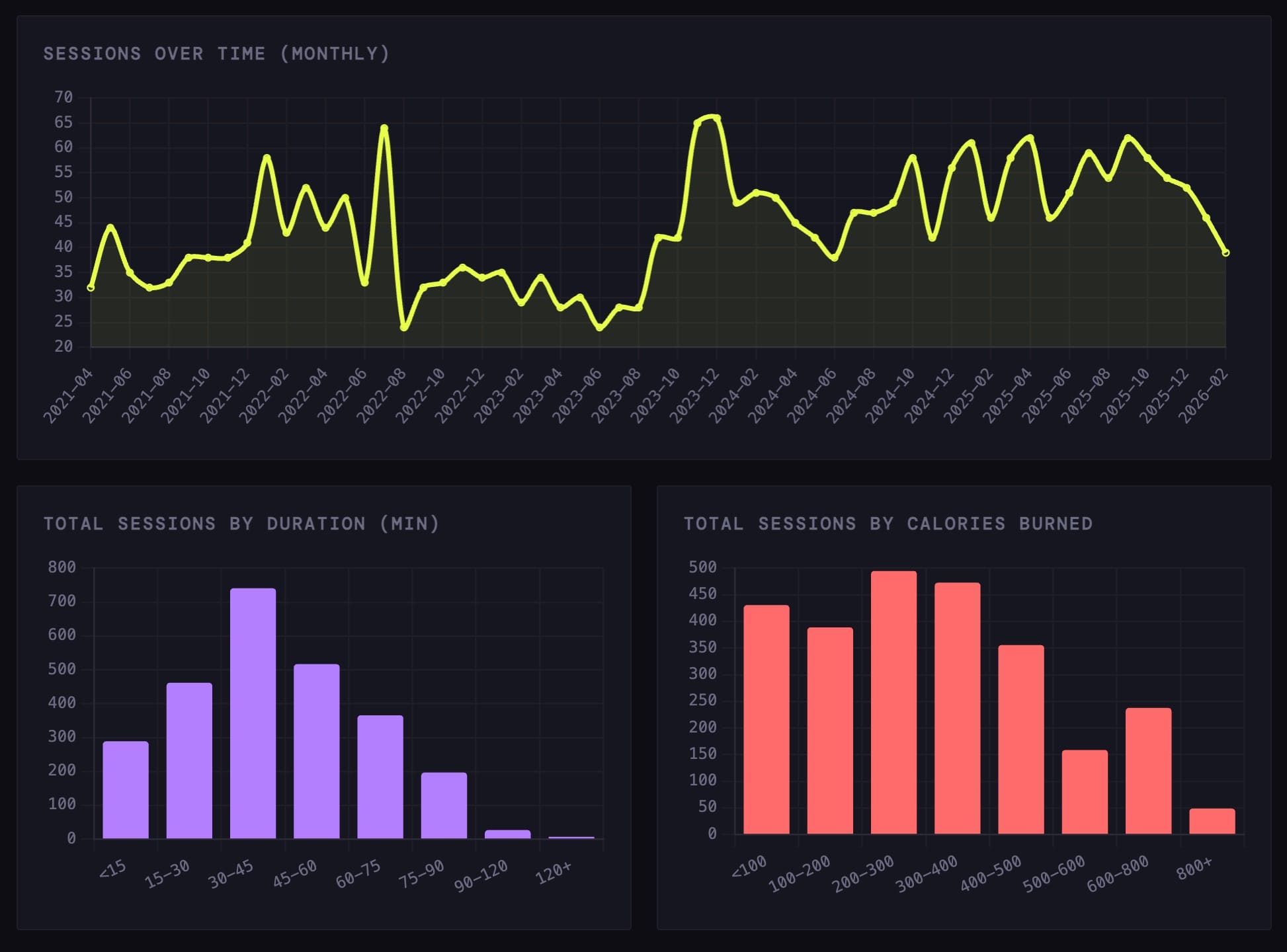 - How do my workouts break down by time? A simple histogram would answer that question.