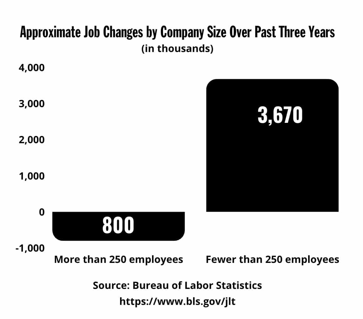 That number starkly contrasts with larger businesses that employ 250 individuals or more. As a whole, the latter group has trimmed 800,000 net jobs during this three-year period.