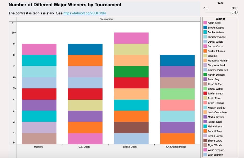 Contrast that with tennis. The era of the Big Three is alive and well. Case in point: Only six different men have won major tournaments in the same time period.