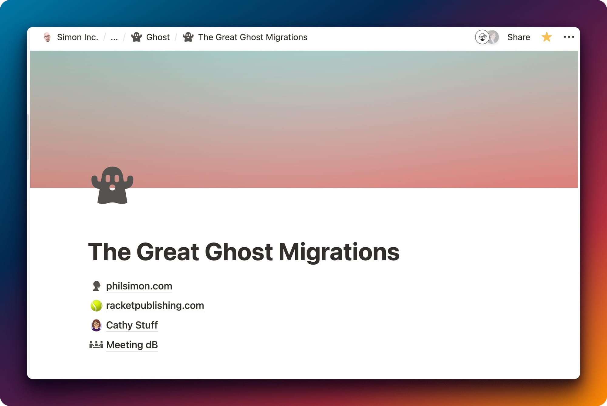 Over the last two months, I moved both of my sites from WordPress to Ghost. A Notion database served as each project's central nervous system.