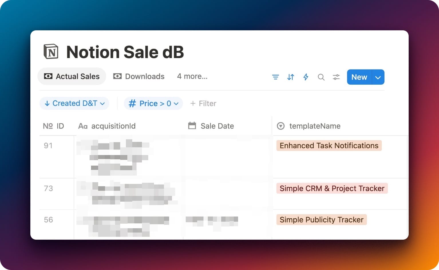 For the last 18 months or so, I've sold templates and courses on the Notion Marketplace (and on Gumroad before that.) When someone purchases one of them, a Notion webhook sends the sale toโwait for itโa dedicated Notion database. Pretty meta, right?