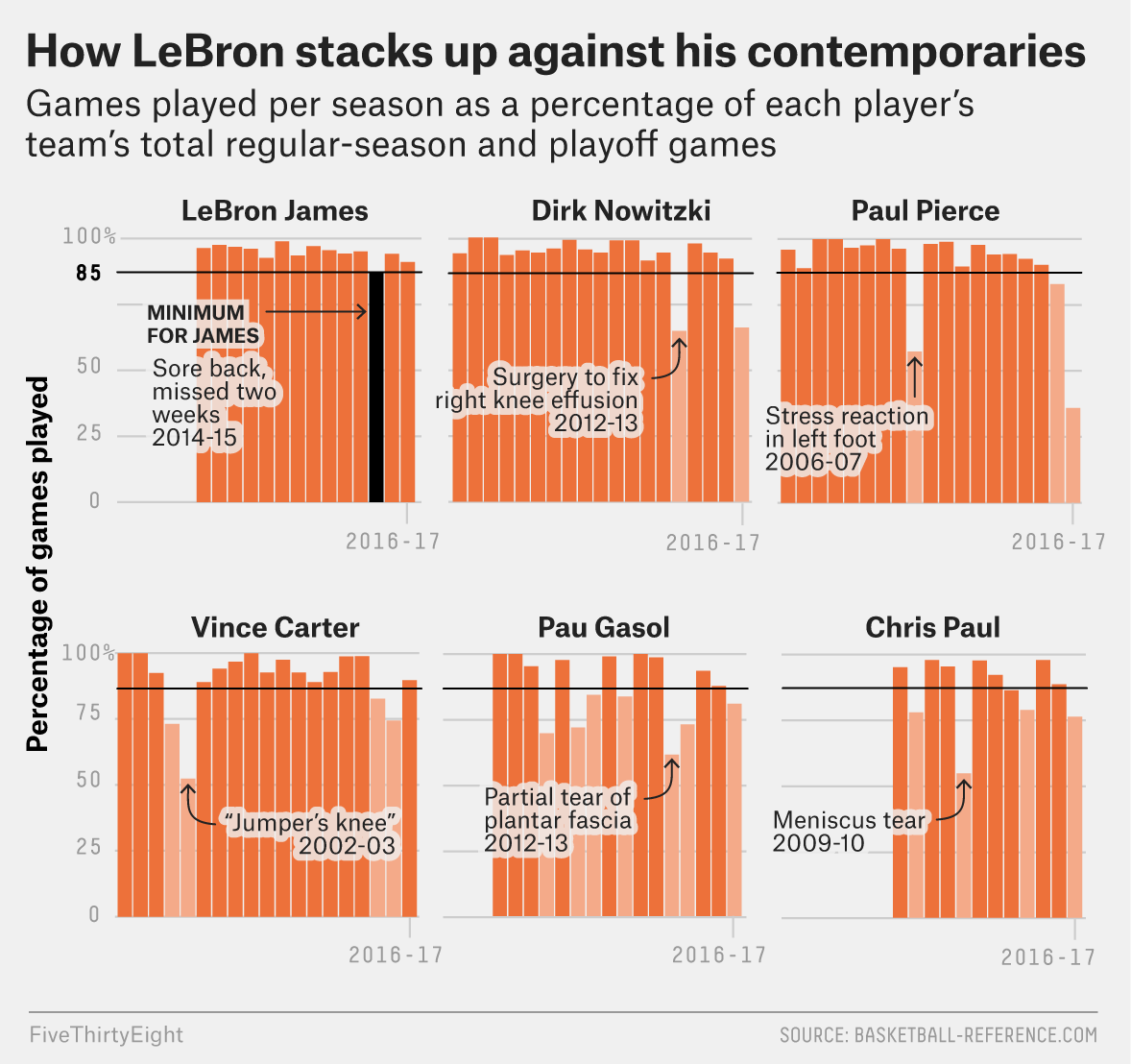 See how 538 effectively represents similar longitudinal data from the NBA by separating charts: