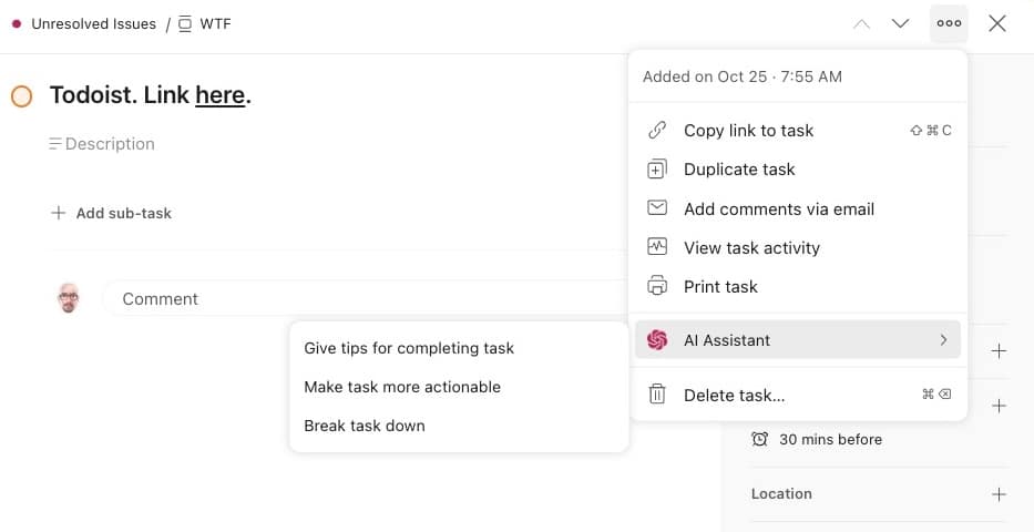 Not surprisingly, Todoist recently hopped on the über-popular AI train. Here's a screenshot of its new AI Assistant: