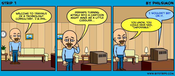 So, as if I donβt already spend far too much time in front of a computer, allow me to introduce a new segment on my site: Travails of a Technology Consultant. Until sued by someone in the cartoon (and successfully, I might add), Iβm going to be creating one of these every Monday. Thatβs right. Start off the week with little humor from a guy with a big ego.