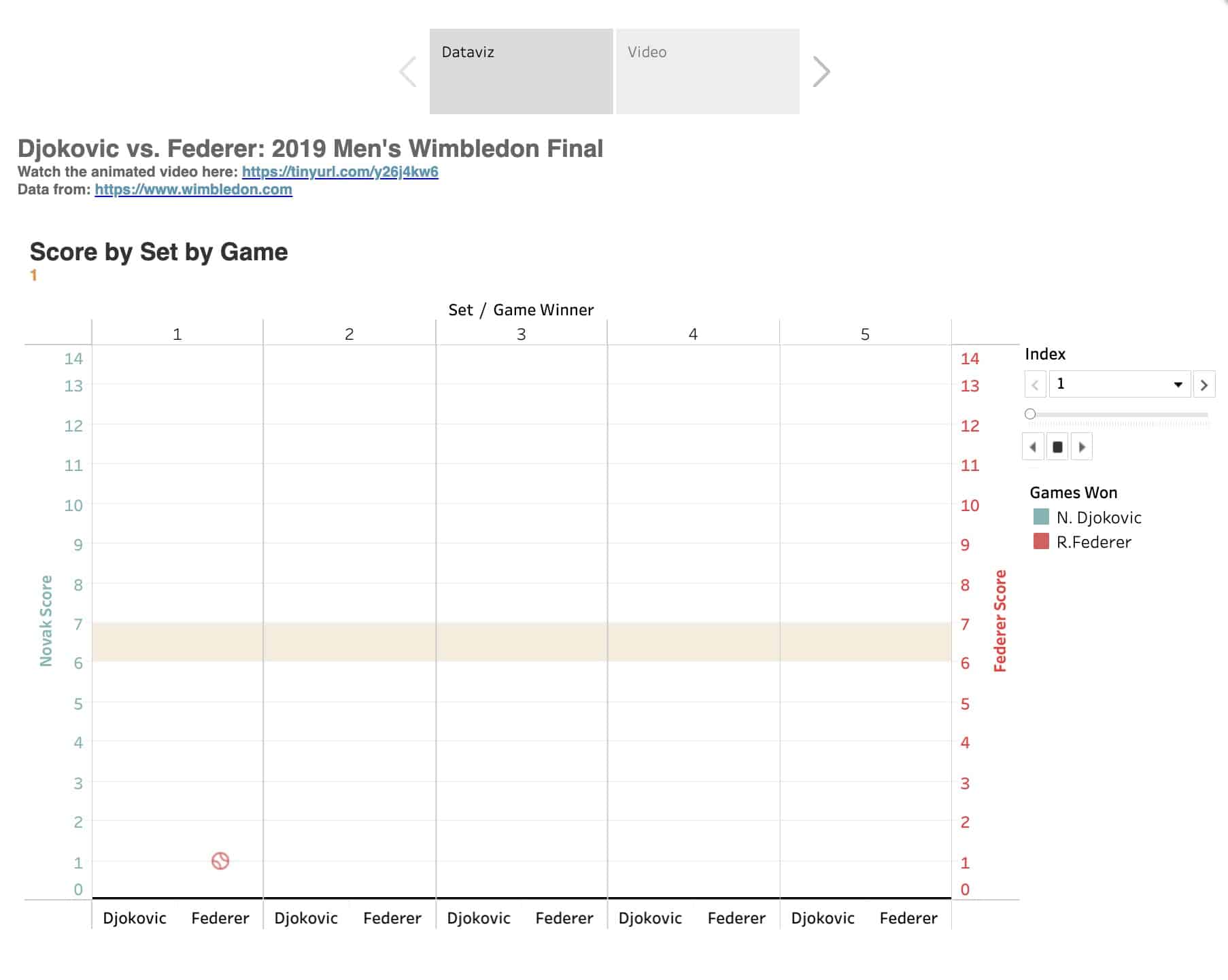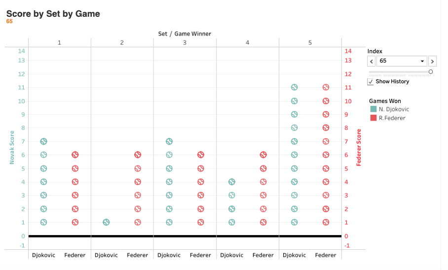 At the gym yesterday, I did my normal Wednesday workout while catching glimpses of the 46th Annual Cherry Pit Spitting Championship on ESPN The Ocho. (Yeah, that's a thing.) My eyes were one place but my mind was elsewhere. Specifically, I couldn't stop thinking about how I could represent in Tableau one of the five most exciting tennis matches I've ever seen: the 2019 Men's Final between Djokovic and Federer.
